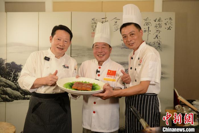 7月23日,湘菜大师徐大斌(中)和徒弟展示制作完成的毛氏红烧肉。 吴悠 摄