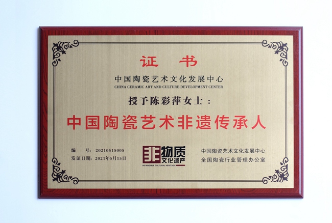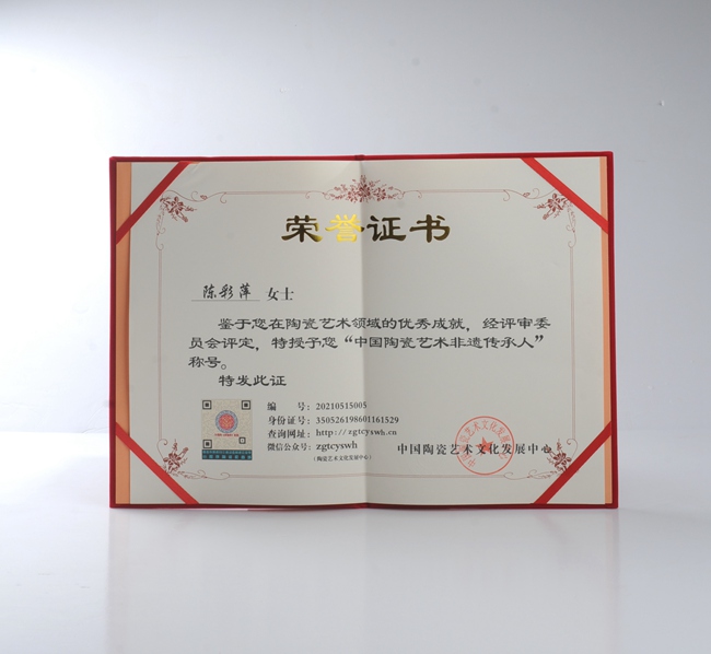 陈彩萍——中国陶瓷艺术非遗传承人 陈彩萍,女,高级工艺美术师、中国陶瓷艺术非遗传承人、优秀创作坊工作室、中国陶瓷艺术文化发展中心会员。1986年出生于中国瓷都德化一个手绘世家, 爷爷和父亲都是技艺精湛的手绘艺人,从小深受陶瓷文化熏陶,2017年成立手绘工作室,专业从事中高端茶器手绘设计开发制作,作品多次在国家省市工艺美术作品评比中获金奖《国色天香禅定杯》荣获2021年中国国际北京陶瓷艺术名家作品展金奖,其作品深受广大藏友喜爱。