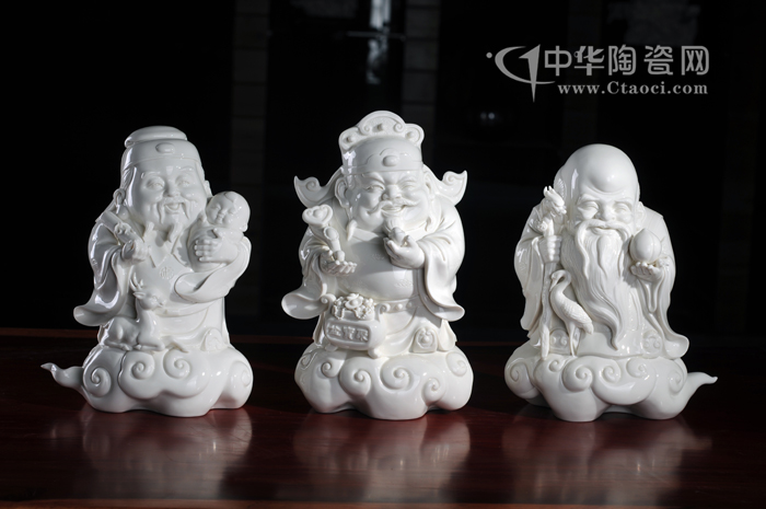 这里介绍的一组福禄寿三星瓷塑(上图),为当代福建省陶瓷艺术大师张祥琦创作,作品高度约26cm,烧制精细,栩栩如生。
